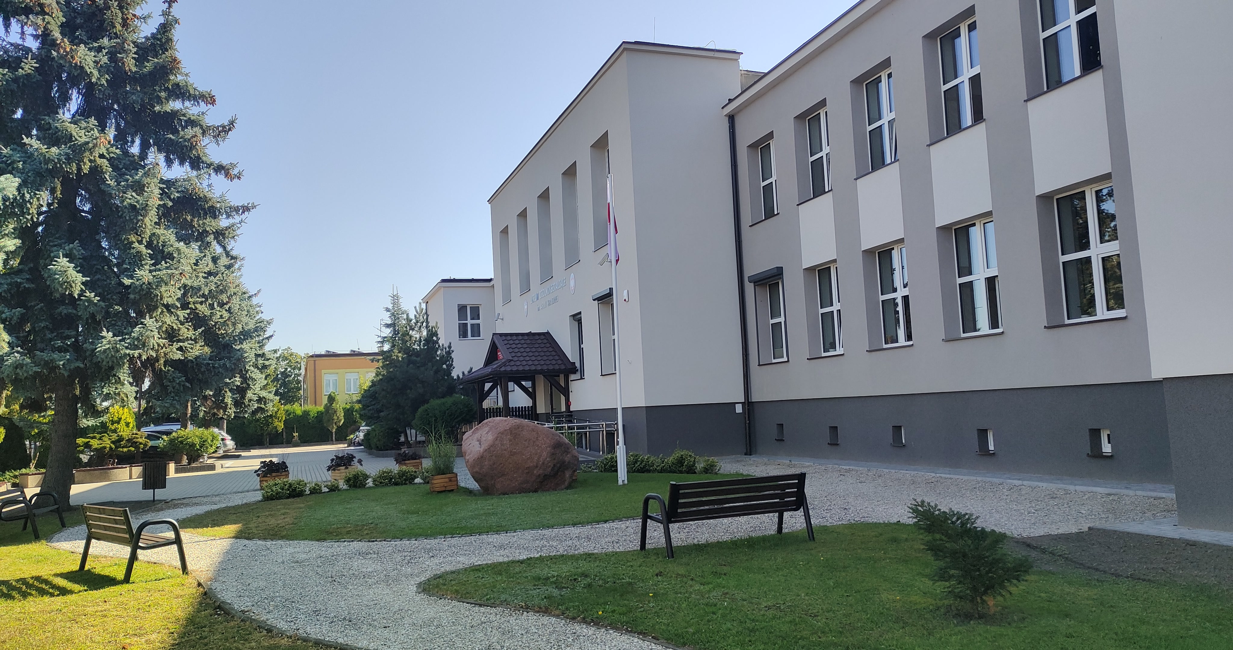 Nowy wygląd zyskał także dziedziniec szkoły. Wzdłuż alejek zostały zamontowane nowe ławki, kosze na śmieci. Pojawiły się także nowe nasadzenia zieleni i roślin trawiastych. Przy pomniku znajdującym się na placu zmodernizowano maszt flagowy. Zwieńczeniem prac było wykonanie napisu na elewacji budynku.